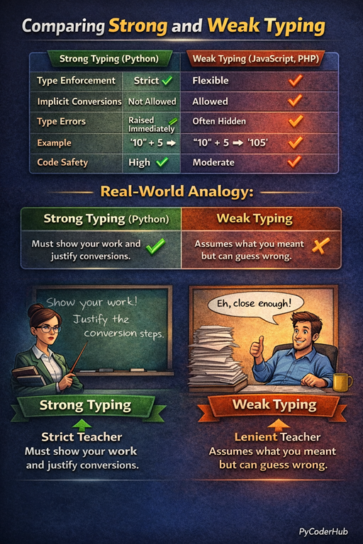 To truly understand Strong Typing in Python, it helps to compare it directly with weak typing. Both approaches aim to handle data types, but they differ greatly in how strictly rules are enforced and how much the language tries to “help” by guessing your intent.